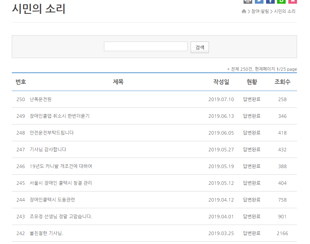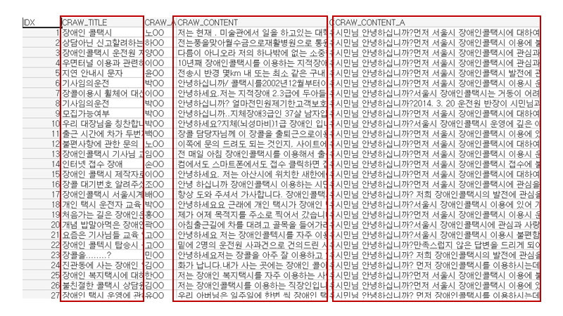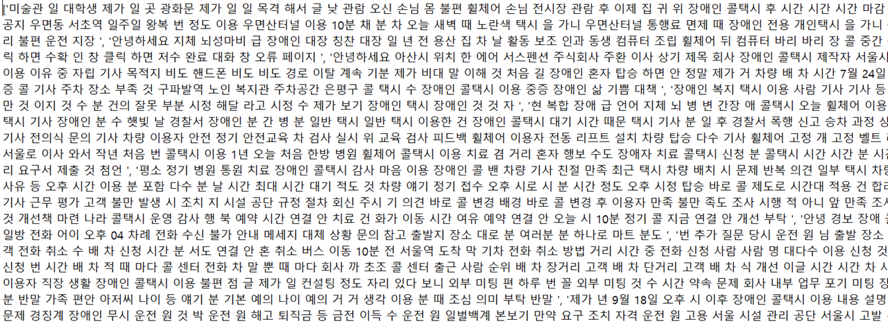 우리는 장애인 콜택시를 이용한 시민들의 '시민의 소리'게시글을 이용해서 분석을 진행했다.