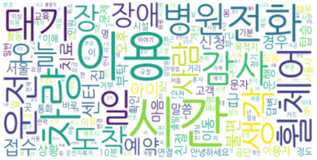 대략 키워드를 통해서 예상할 수 있는 문제는 이용시간, 대기시간 등 시간에 대한 문제가 많을 것으로 보이고 장애인 콜택시를 통해서 병원에 자주 가는 것 같다. 또한 전화나 차량에 대한 이슈도 가능성이 충분하다는 게 예측이 가능하다.