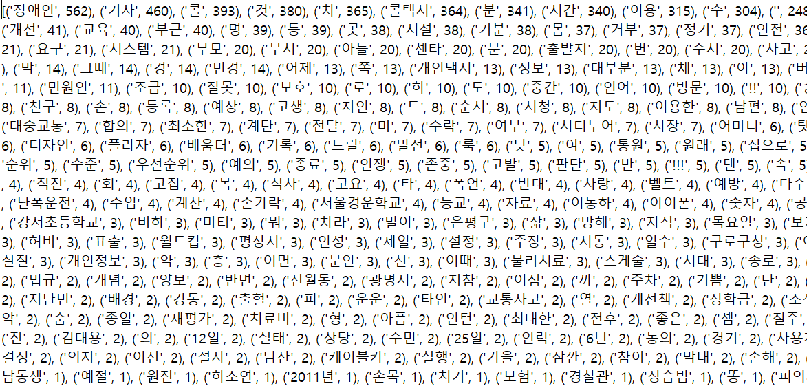 그렇다는 건 '장애인', '콜택시'등의 단어들은 당연히 자주 나올 것이라는 것을 알 수 있다. 또한 의미 없는 '등', '것' 등도 추가적으로 제외를 시켜서 블랙리스트를 생성하고 제외시킨다.