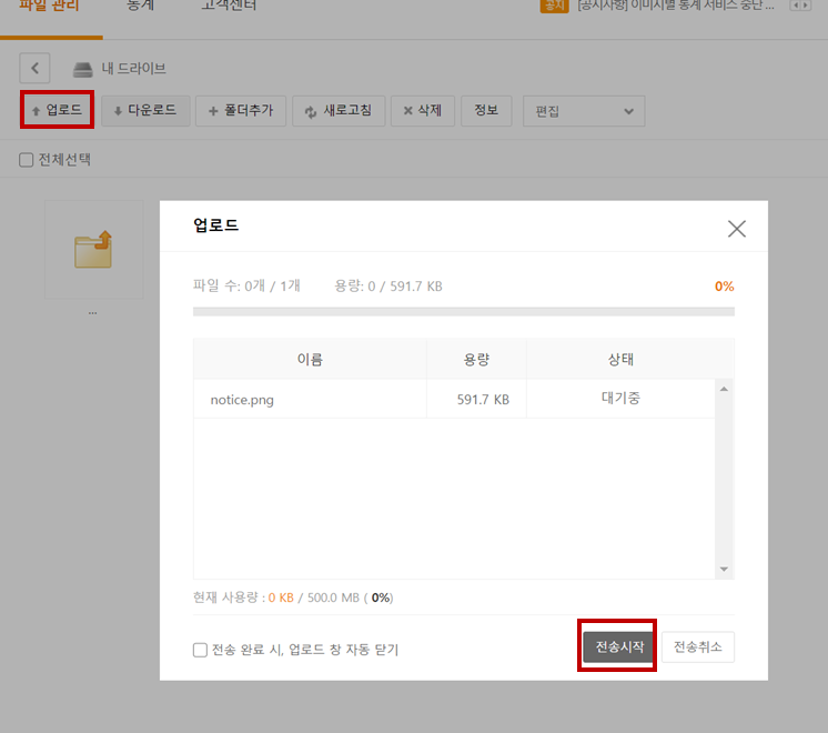 4. '업로드'를 누르고 업로드할 이미지를 선택 -> '전송시작'를 눌러서 업로드를 진행하면 됩니다.