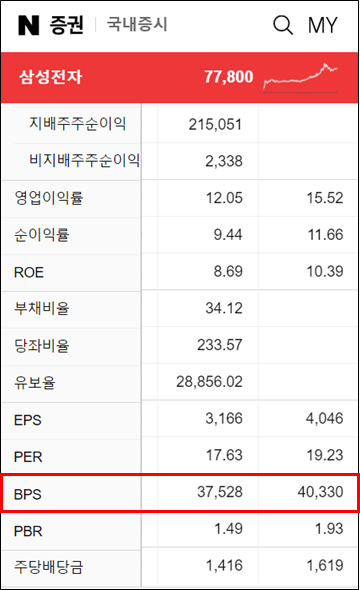이렇게 직접 계산하는 방법도 있지만, 계산되어 있는걸 쉽게 확인할 수 있는 방법도 존재한다. 바로 네이버 증권에 들어가서 "재무"탭에 가보면 모바일로도 이렇게 기업의 BPS를 쉽게 확인할 수 있다.