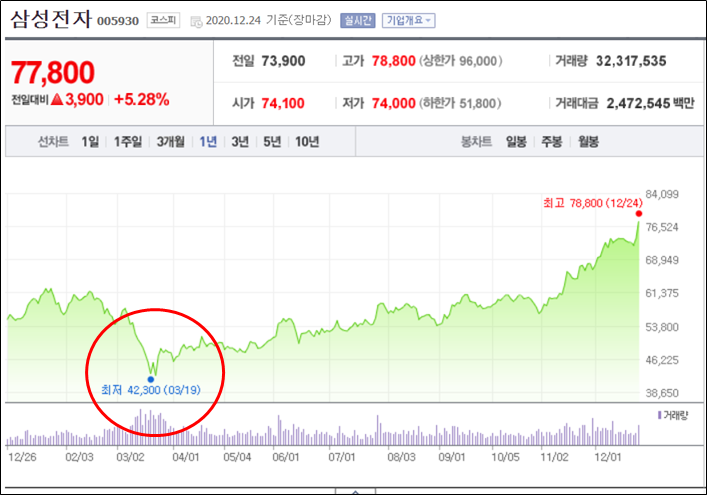 삼성전자 1년 차트를 보면 코로나 팬더믹에 주가가 급락할 때, 정확히 3월 19일 42,300원까지 빠진 것을 볼 수 있다. 바로 51기(2019년) 기준으로 BPS 44,035 (원)이므로, 삼성전자가 이날 하루아침에 망해서 모든 부채를 처분하고 남은 자산을 주주들에게 돌려준다 했을 때, 한주 당 약 700원이 남게된다.(BPS보다 떨어진 주가)