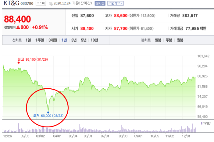 3월 23일 기준으로 KT&G 주가는 63,000원을 찍고 반등했다. 이 말은 이 가격에 주식을 샀다면 이 기업이 망하더라도 주당 5,778(원) 씩은 돈을 벌 수 있다는 얘기이다. 그래서 그런지 KT&G도 6만원대 밑으로는 주가가 내려가기 힘들다고 생각해도 좋다.