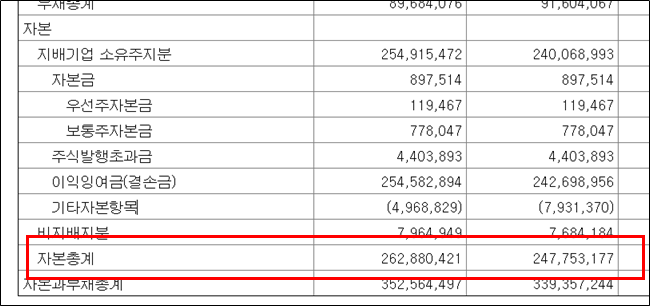 BPS는 "자본총계/상장주식수"로 계산한다. 그래서 DART에 들어가서 대차대조표(재무상태표)를 보면 이렇게 자본총계를 확인할 수 있는데 이 숫자를 유통되는 총 주식수로 나누면 된다.