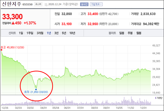 코로나 이전에도 주가는 BPS의 절반 수준이였다. 즉 주식을 4만원대에 매수하고 이 은행이 망해서 자산을 다 처분하더라도 주당 5만원 정도는 주주들에게 돌아간다는 얘기이다. 그런데 3월 20일 21,850 (원)까지 떨어지고, 약간의 회복으로 3만원대에 있을 뿐, 코로나 이전의 가격으로도 돌아가지 못했다.
