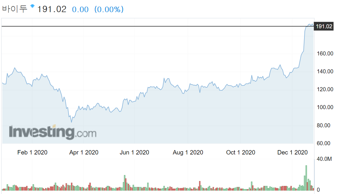 바이두는 미국 나스닥에 상장되어 있음. 티어는 BIDU 이다. 현재 주가는 191불(20년 12월 24일 종가 기준)이고 시가총액은 65억 (달러)이다.