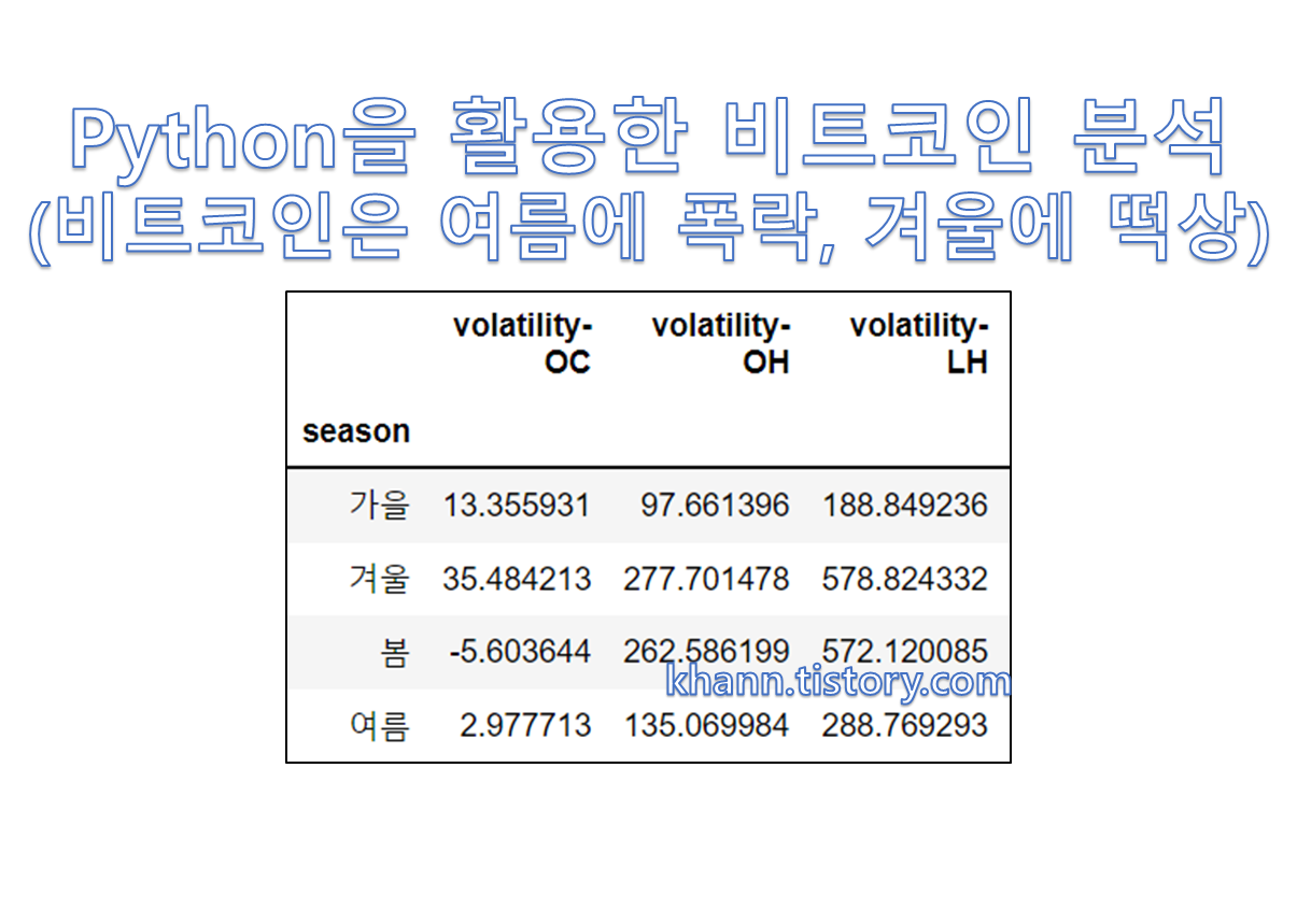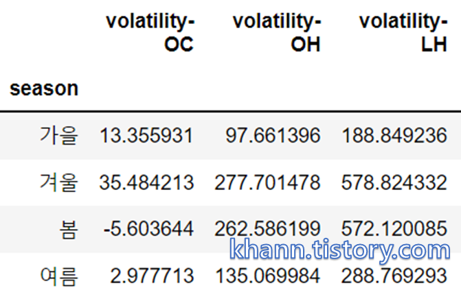 그리고 가을에는 당일 시작가 -> 당일 최고가(volatility-OH)가 가장 낮다. 이 시기에는 하루에 가장 큰 상승을 기대하기는 어려웠다. 매일 조금 씩 천천히 오르면서 겨울 상승을 위해 준비하는 것 처럼 보인다.