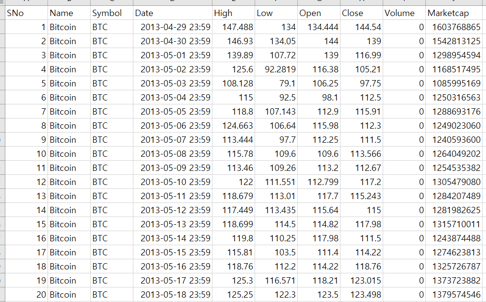 필자는 kaggle에서 2013년 4월부터 2021년 7월까지의 비트코인 가격 데이터를 가져왔다.