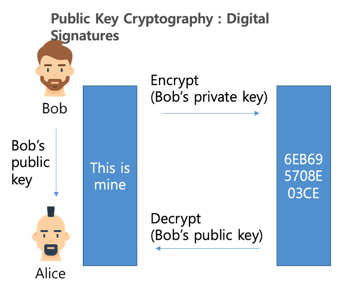 이러한 공개키 암호화 방식을 이용하여 디지털 서명을 만들어낼 수 있다. Bob은 자신의 개인키로 암호화(여기서는 서명)한다. 그러면 이 암호문은 Bob의 공개키로만 복호화 할 수 있다. 그러므로 이 암호문은 Bob의 소유(또는 Bob이 만든 것)이 되므로 소유를 증명할 수 있다.
