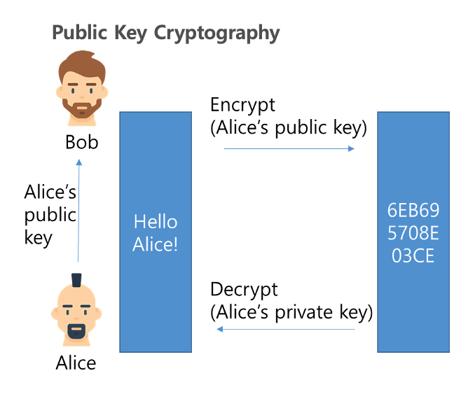 공개키 암호화는 암호화와 복호화에 사용되는 키가 2개이다. 보통 비밀키를 이용하여 공개키를 만들고 공개키는 누구에게나 공개해도 된다. Bob은 Alice의 공개키로 암호화하여 암호문을 만들면 Alice는 자신의 비밀키로 복호화를 한다.