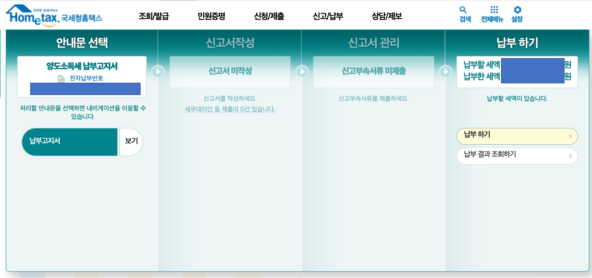로그인을 하면 바로 "양도소득세 납부고지서 안내문"이 뜹니다.