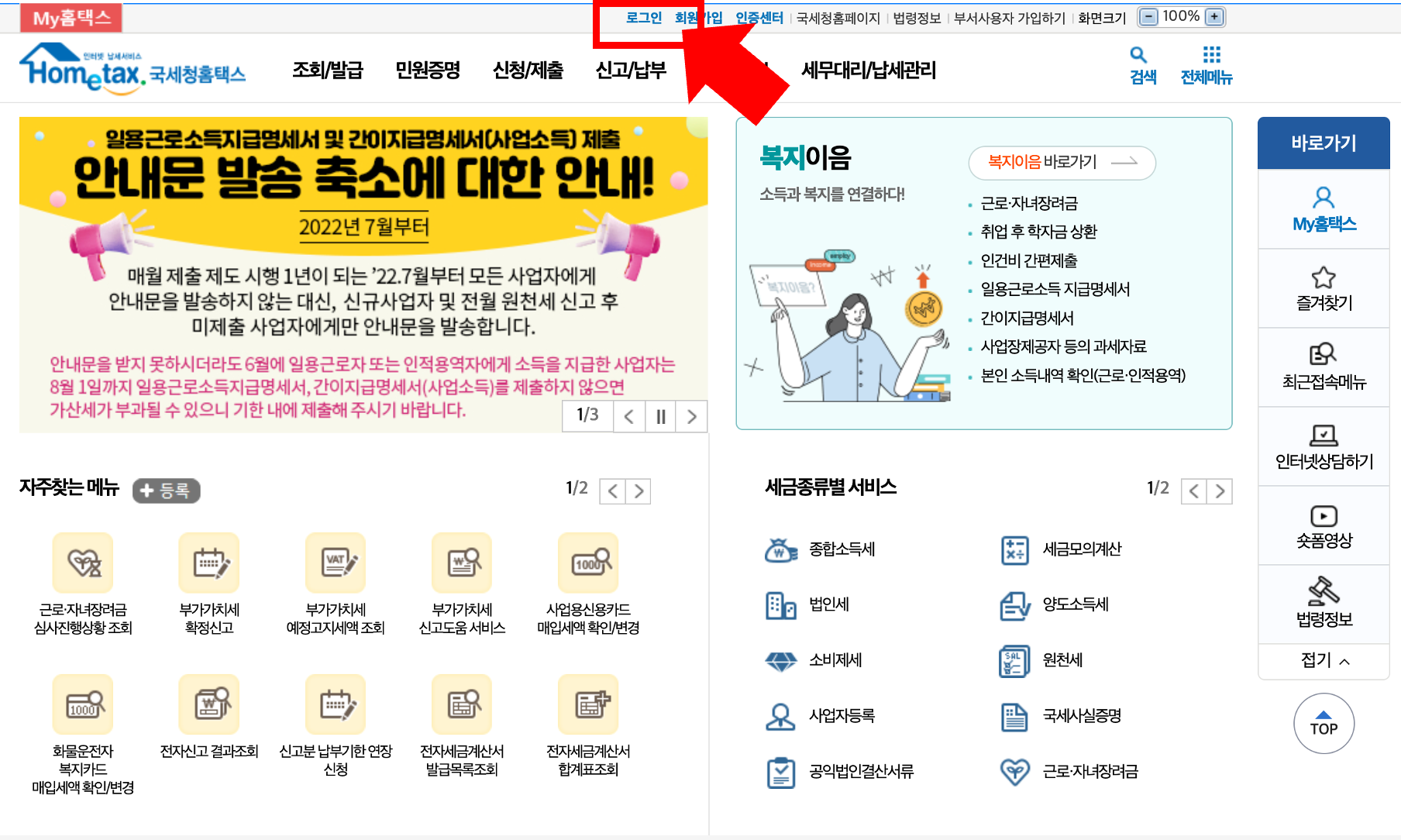 홈택스에 방문하여 "로그인"을 눌러줍니다.