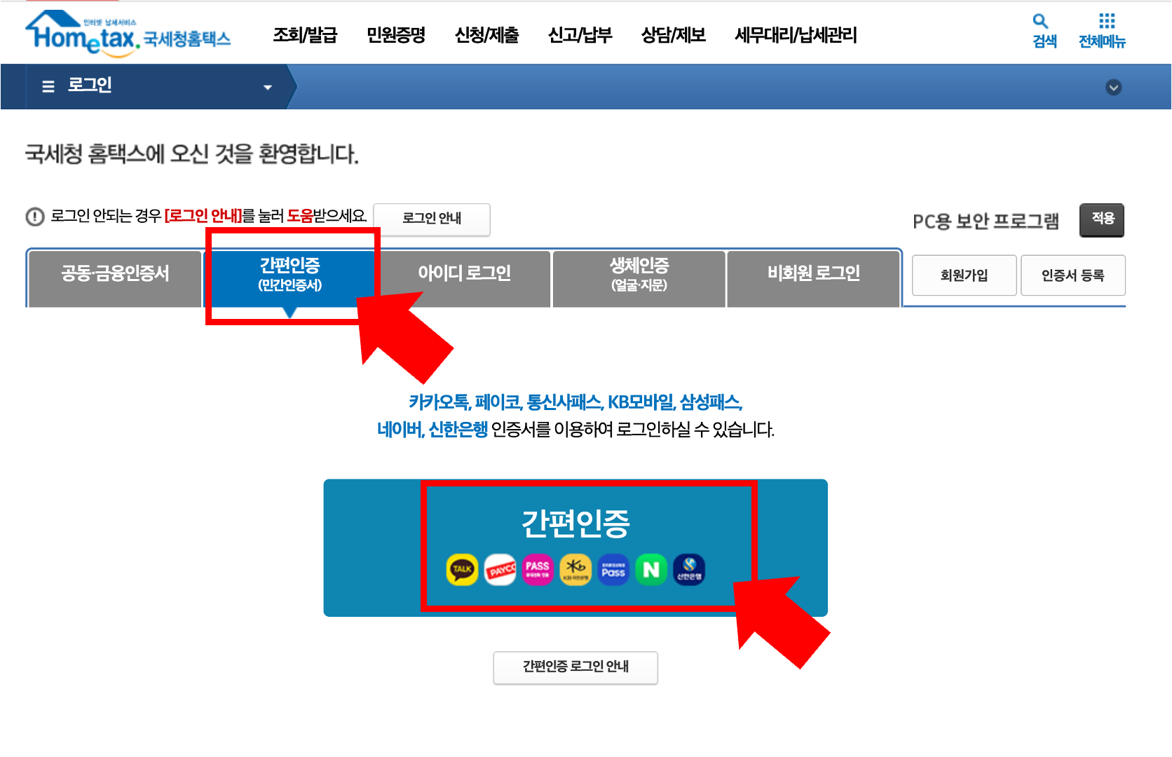 저의 경우는 "간편인증"을 선택했고 간편인증으로 로그인했습니다.("아이디 로그인"을 선택해서 로그인하더라도 인증서를 통한 로그인 과정이 필요합니다.)