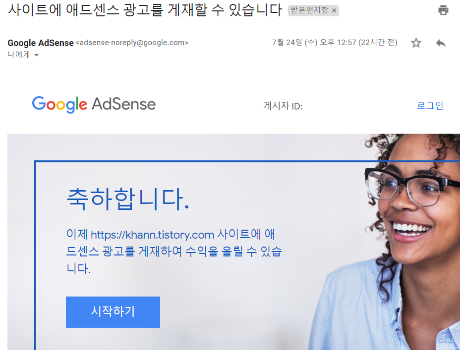 그리고 24일 오후 12시 점심을 먹고 있는 중에 구글 애드센스로부터 또 메일이 왔다. 바로 '애드센스 승인' 메일이었다. 예상보다 너무 빠르게 승인이 되어 놀랐다. 원래 계획은 한번 거절당하고 피드백받은 다음 신청하려고 했었는데..