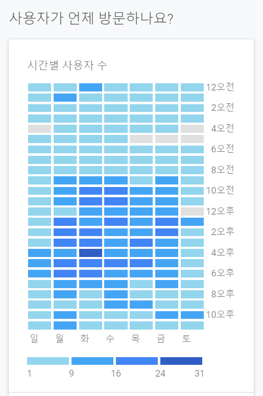 구글 애널리틱스에서 히트맵 형식으로 제공이 된다. 색이 진할수록 많이 방문한다는 의미인데, 토요일엔 거의 방문자가 없고 월~금 워킹데이의 오전 10시부터 6시 사이의 워킹타임 때 방문자수가 높았다.