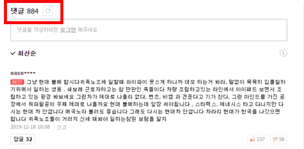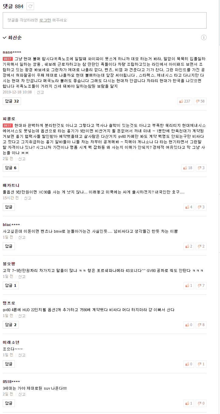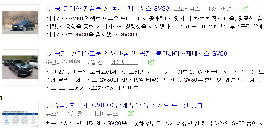 네이버 자동차의 "자동차 토크"에서는 자동차에 대한 댓글을 적을 수 있는데 그 아래에 저런 문구가 적혀있더라고요. "전체기사의 댓글이 접혀서 제공됩니다". 이 말 뜻이 여기 댓글들이 GV80의 기사 댓글까지 포함하고 있는 건지는 모르겠습니다.