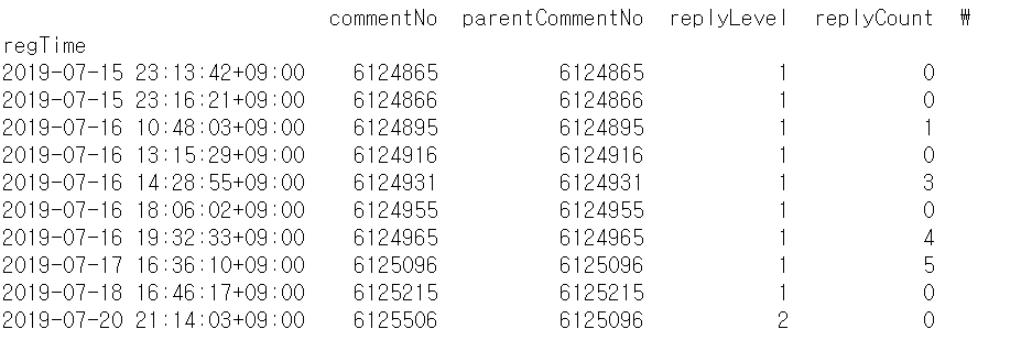 우리는 일별 댓글 양을 알아봐야 하기 때문에 regTime 필드를 이 dataframe의 인덱스로 바꿔줄 겁니다. 그런데 지금 이 필드를 보니 타입이 object로 되어있기 때문에 datetime으로 바꿔줘야 됩니다.