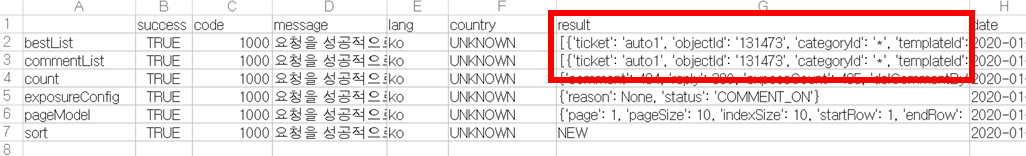 result안의 json을 추출해서 다시 dataframe으로 바꾼다음 csv로 바꿨습니다. 이제 댓글 별로 리스트업이 되네요. 이제 이걸 전부 리스트업 해서 필요한 필드만 뽑아서 따로 저장해야겠습니다.