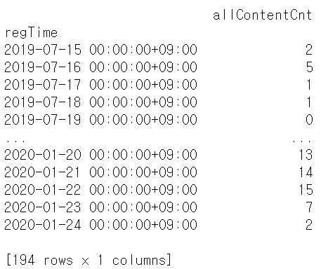pandas의 resample 메소드로 카운트를 해줘야 되는데, 카운트를 해주기 위해서 'allContentCnt'라는 필드를 만들어 1을 입력해줍니다.