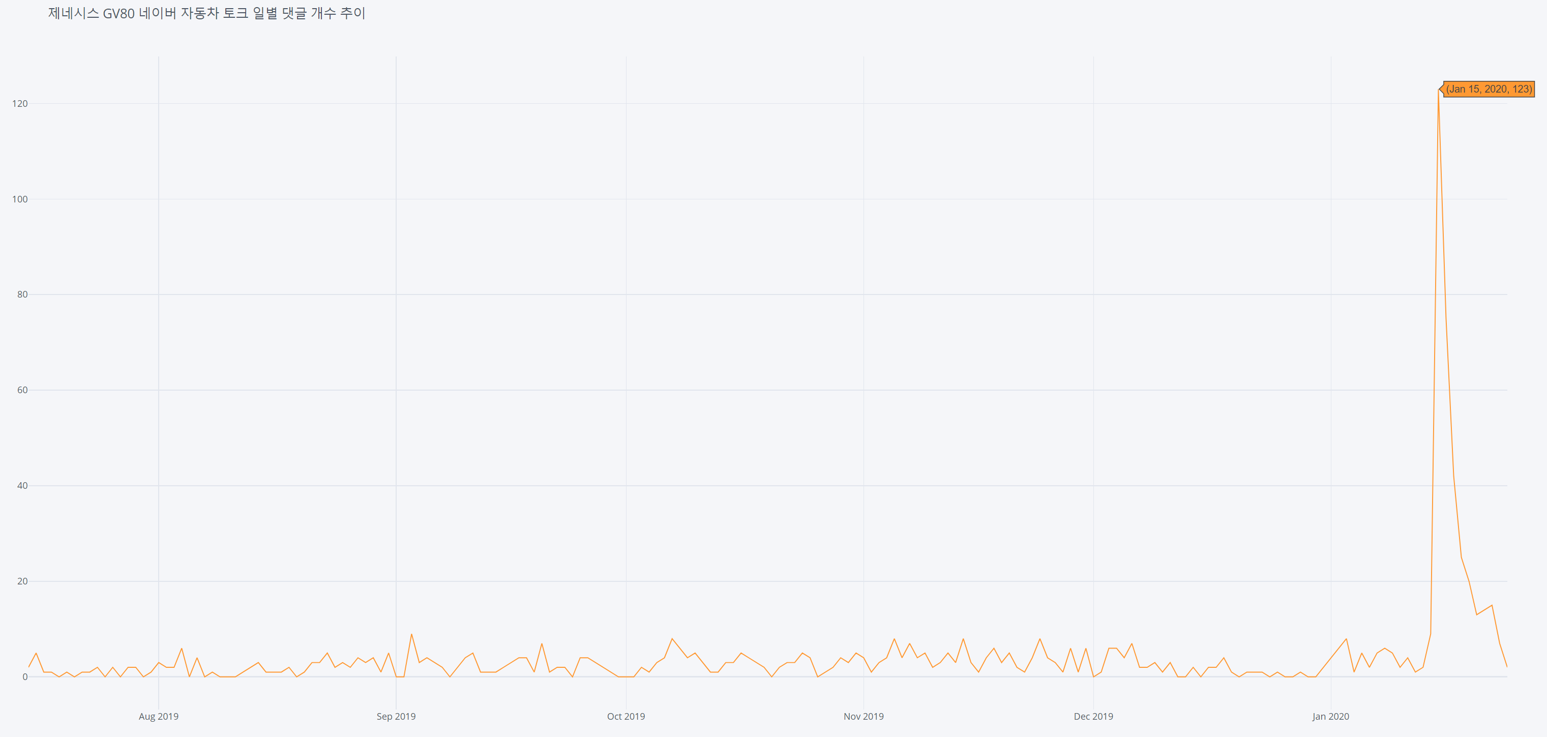 이 그래프를 보면 2019년 7월 15일부터 약간의 반응씩만 보이다가 1월 15일 신차 발표 때 엄청난 댓글이 생성된 것을 확인할 수 있습니다.
