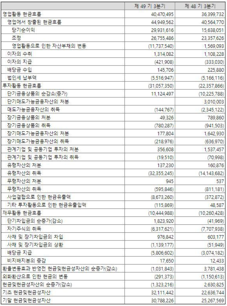 현금흐름표는 실제로 오고간 현금의 흐름을 관리하는 표입니다. 즉 아직 잔금을 치루지 않은 어음이나 대금이 자산상에는 적혀있지만 그와 다르게 실제로 돈이 오고간 기업의 속사정을 그대로 보여주는 재무제표입니다.