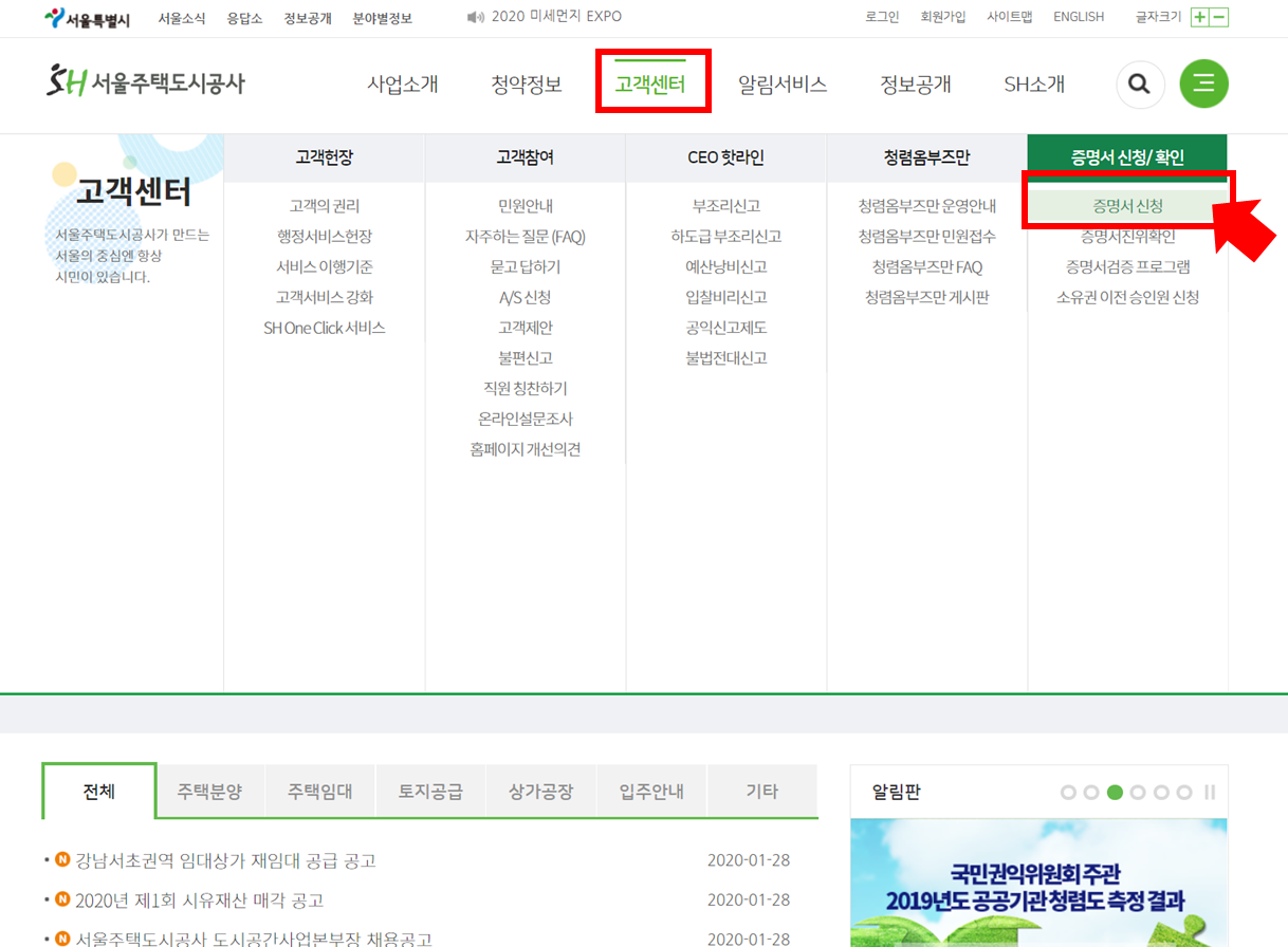 2. "고객센터" -> "증명서신청" 클릭해줍니다.