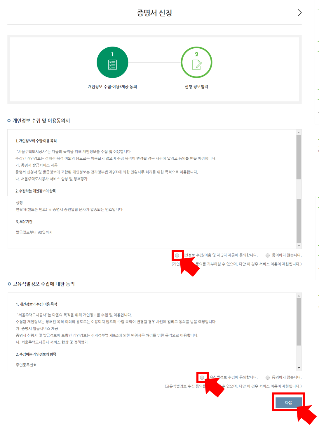 6. 개인정보 수집 이용/제공을 동의하고 아래의 "다음"을 클릭해줍니다.