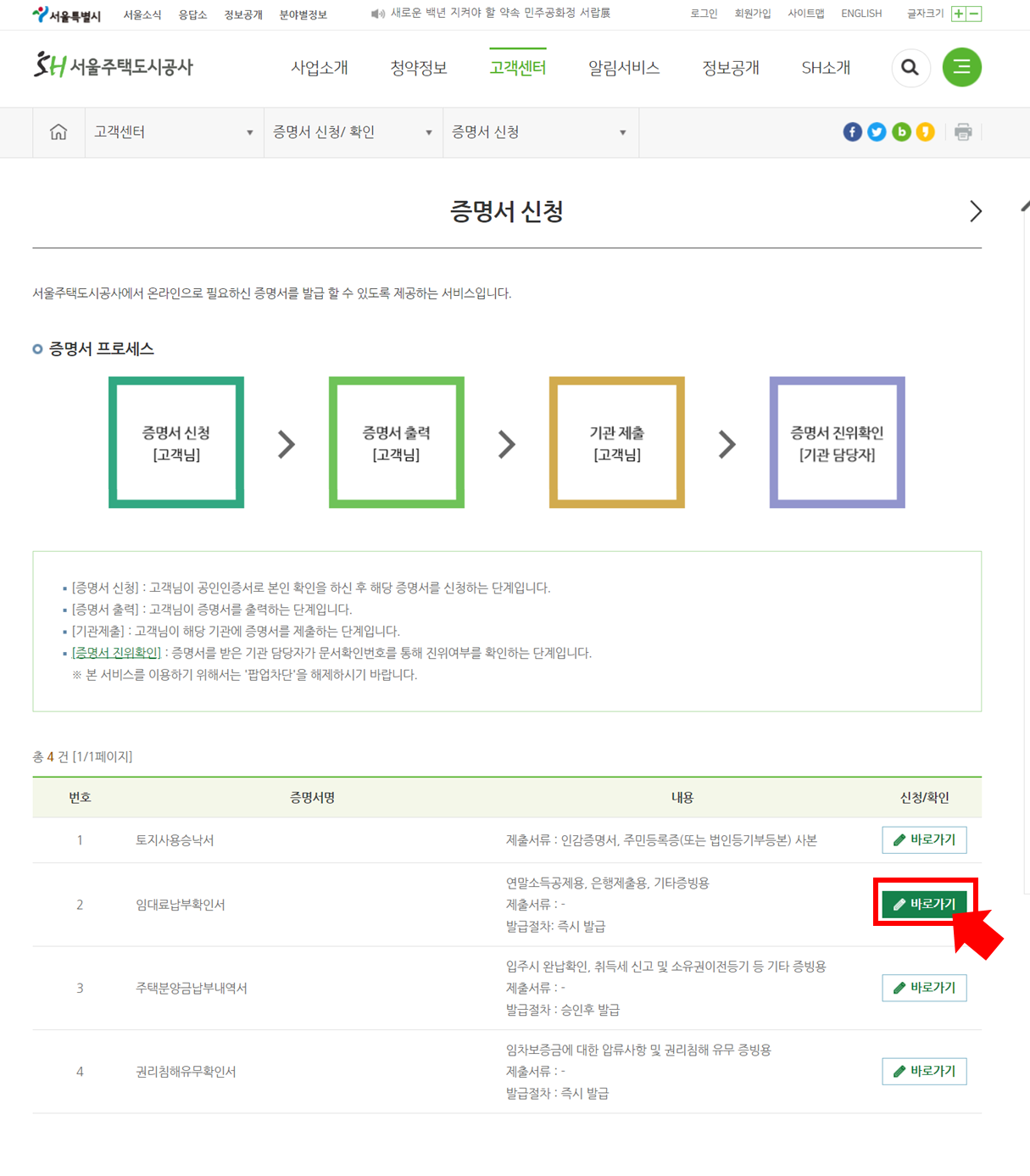 이 페이지에서 아래 2번 임대료납부확인서 오른쪽의 "바로가기"를 클릭해줍니다.