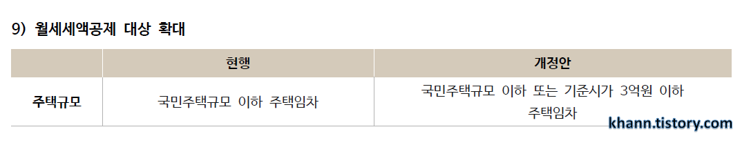 현행 "국민주택규모 이하 주택임차"에서 "국민주택규모 이하 또는 기준시가 3억원 이하 주택임차"로 바뀌었습니다.