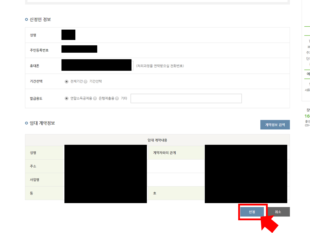 7. 신청인 정보에서 필요한 정보를 입력하고 오른쪽 아래의 "계약정보 검색"을 클릭해줍니다.
