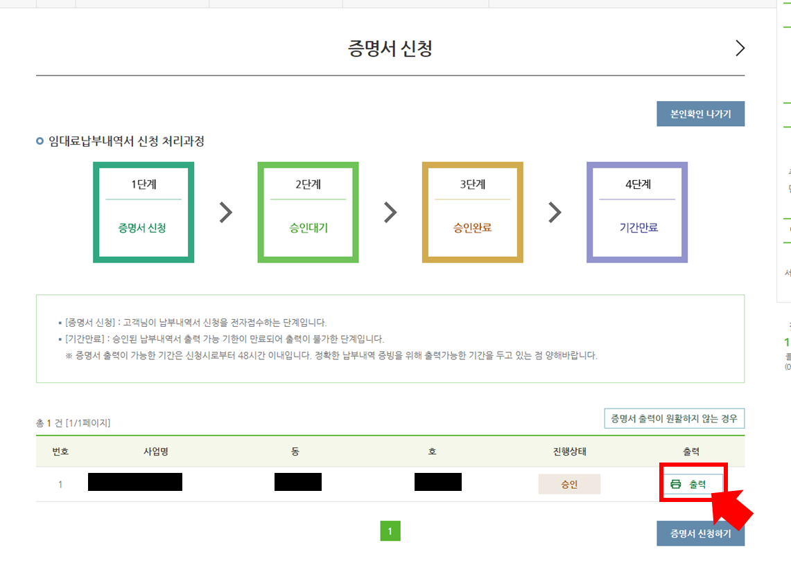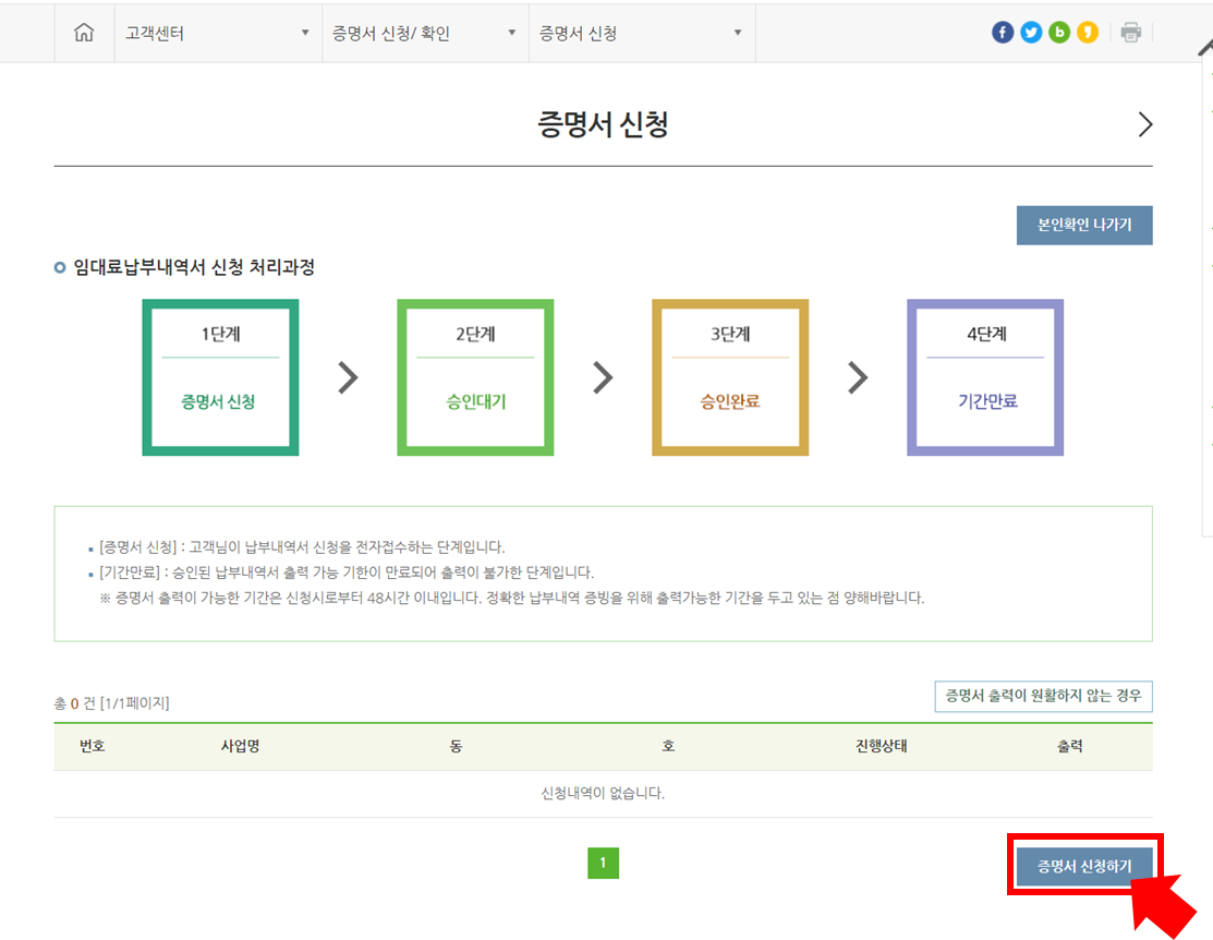 오른쪽 아래 "증명서 신청하기"를 클릭해줍니다.