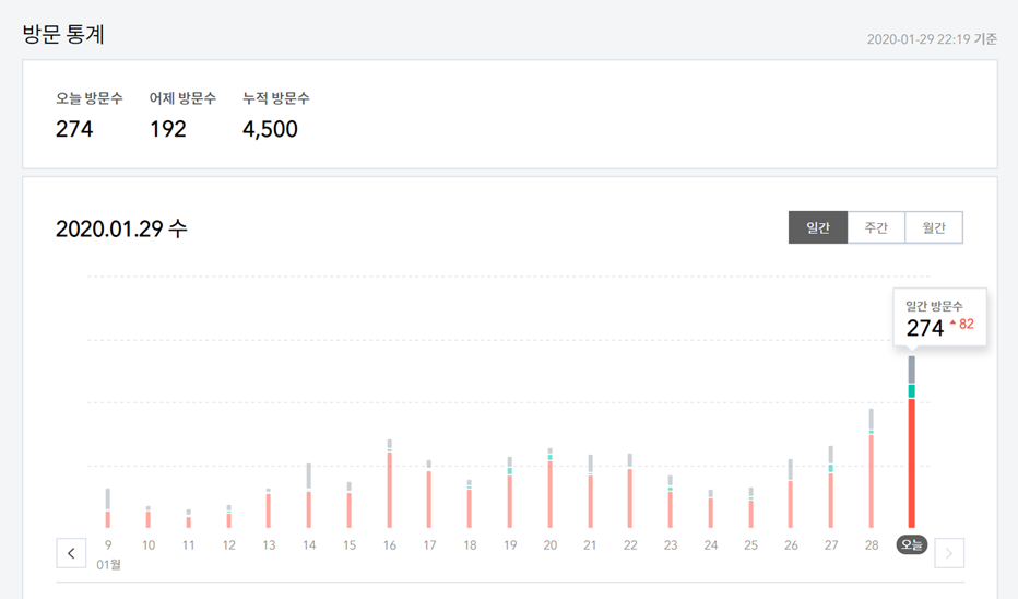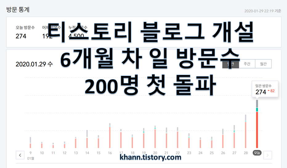 | 티스토리 블로그 개설 6개월 차 일 방문수 100명 첫 돌파 (0) | 2020.01.19 |