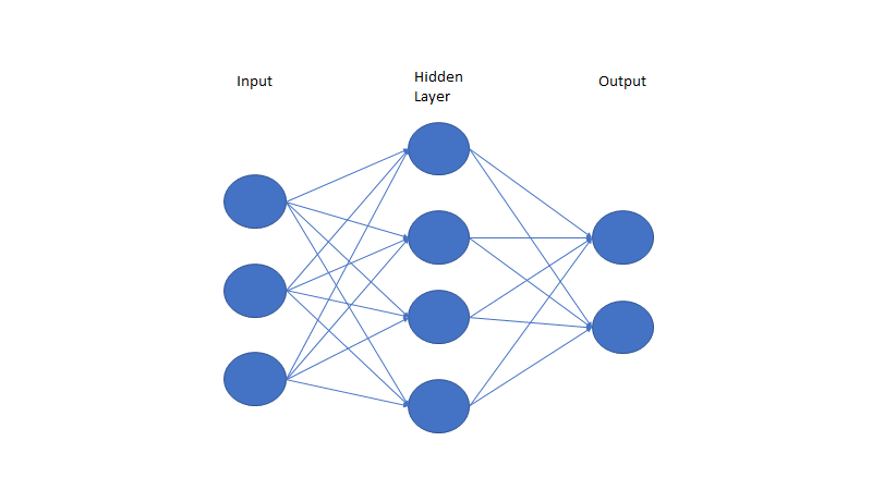 인공신경망은 입력층(Input Layer), 히든층(Hidden Layer), 출력층(Output Layer)로 구성되어있고 파란색원은 뉴런이라고 부른다.