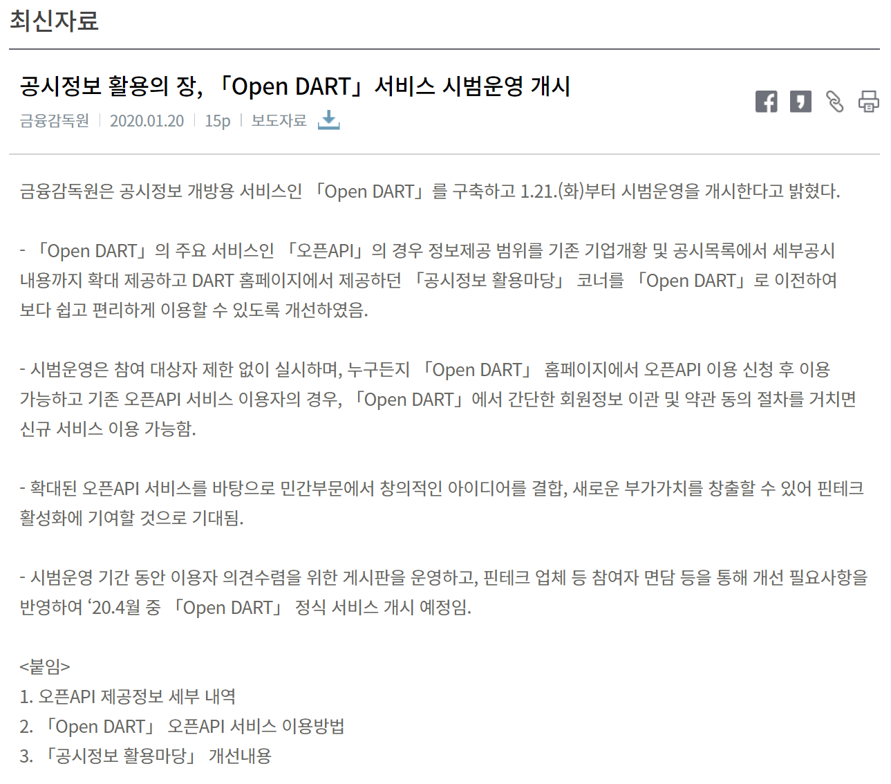 금융감독원이 2020년 1월 21일부터 공시정보 개방용 서비스인 "Open DART"를 시범 운영한다고 합니다.