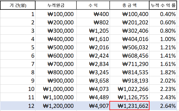 매월 적금 10만원씩을 넣고 월 복리 이자 0.5프로로 1년(연 이율 2.64프로)을 납입한다면