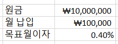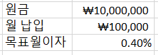 현재 목돈이 있어서 예금이 1000만원을 넣고, 매월 10만원씩 투자할 경우 (월 복리 이자 0.4 프로)