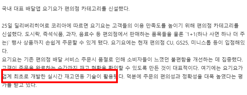 요기요에서는 업계 최초로 개발한 실시간 재고 연동이라는 기술을 가지고 있나 봅니다.