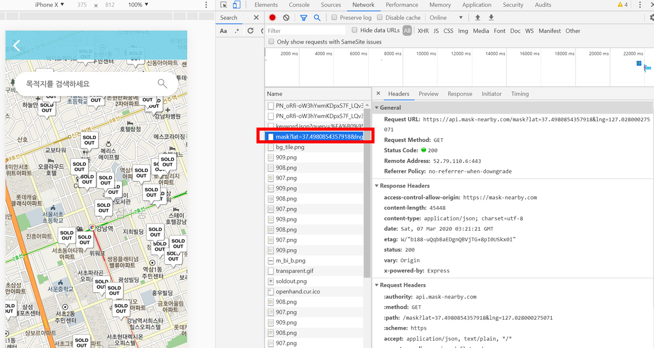 그렇다면 이 포스팅의 제목인 크롬에서 이 마스크 알리미에서 사용하는 API를 추출해서 우리들도 이런 데이터를 요청해서 받을 수 있게 해 볼까요?