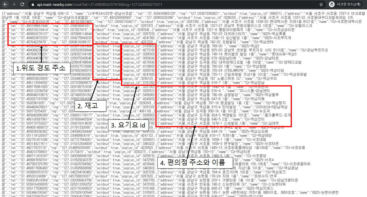 (e.g. https://api.mask-nearby.com/mask?lat=37.4980854357918&lng=127.028000275071))