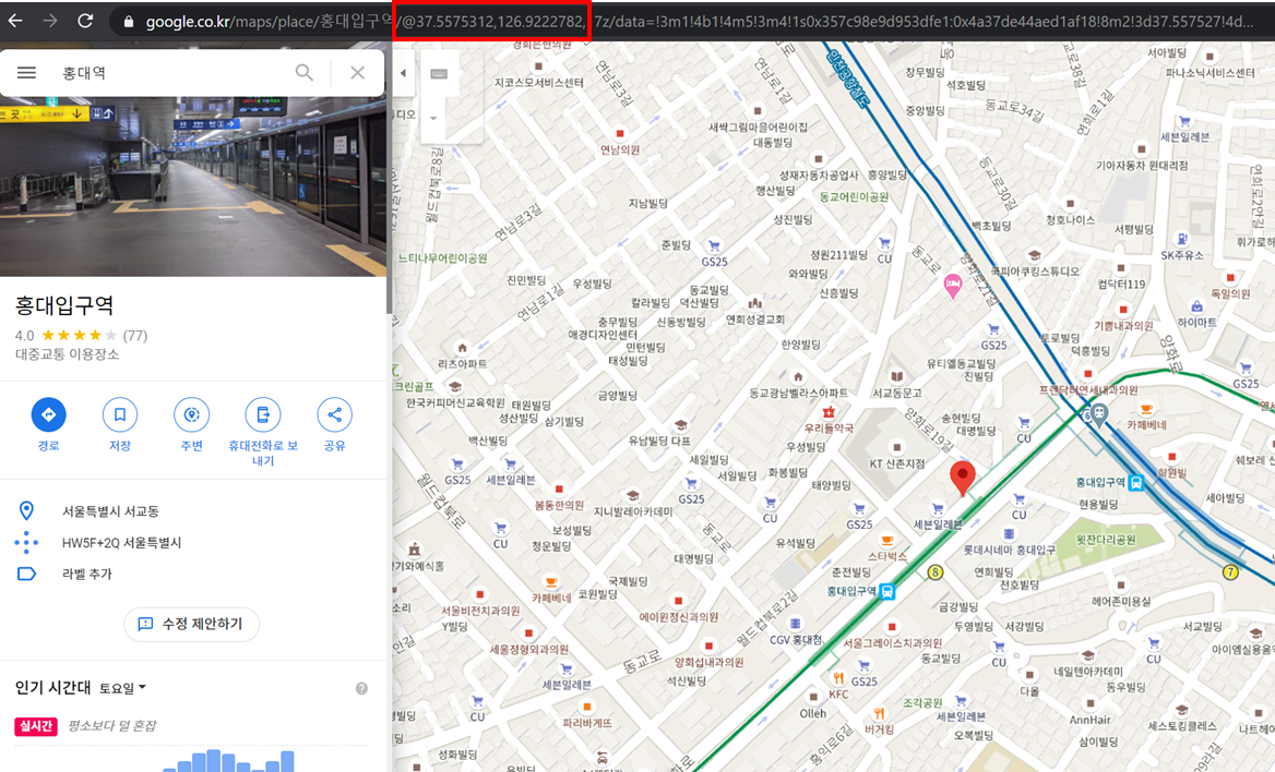 1. 구글지도에 홍대역을 검색해서 위도와 경도를 얻습니다.