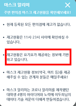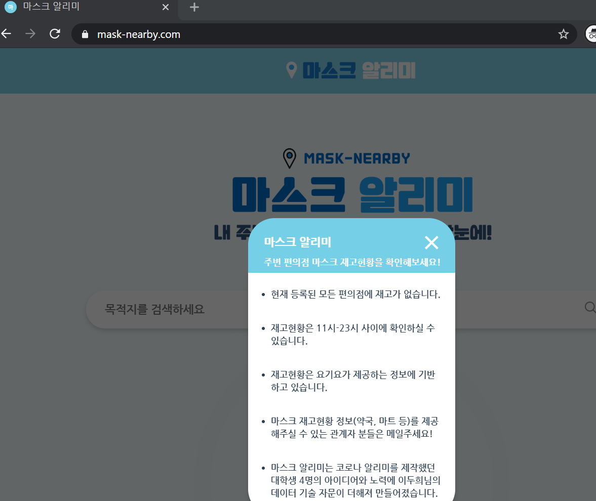 우선 마스크 알리미 사이트에 접속해 봤습니다. 그러니 이런 공지가 뜨네요.