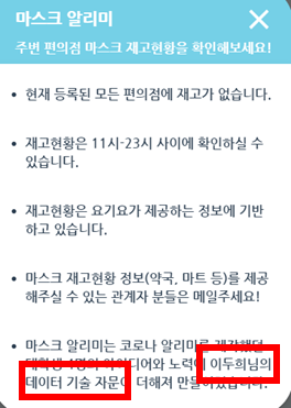 마스크 알리미 홈페이지 공지에 "이두희 님의 데이터 기술 자문"이라는 말이 쓰여있습니다.