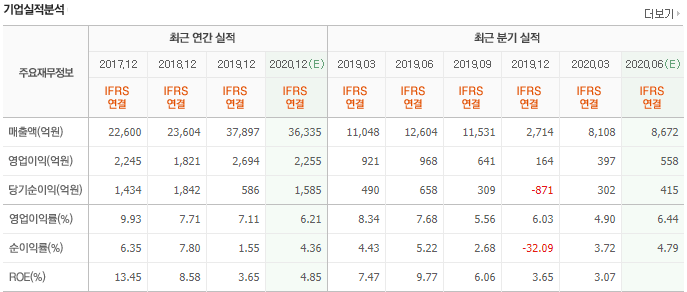 음 19년에 성적이 안좋았다. 당기순이익 586억. 작년 말에 적자였구나.. 올해 예상은 1585억으로 나온다. ROE는 4%대..