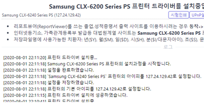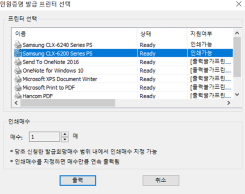 이제 민원24, 학교, 온라인 등기소 등 프린터가 필요한 곳에서 프린터하기를 누르면 아래처럼 "프린터 선택"창이 뜨며 여기에서 "Samsung CLX-6200" 또는 "Samsung CLX-6240"에 "인쇄가능"이 뜨는걸 볼 수 있습니다. 이 두 프린터 중 하나를 클릭하셔서 출력하시면 됩니다.