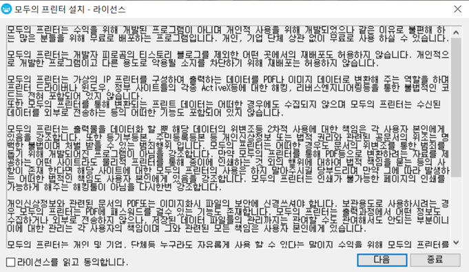 왼쪽 아래에 "라이선스를 읽고 동의합니다."를 체크해주시고 오른쪽 아래의 "다음"을 클릭해줍니다.