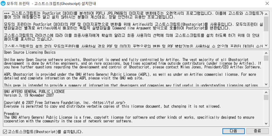출력물을 pdf 및 기타 이미지 포맷으로 변환을 원하시면 고스트스크립트(Ghostscript) 설치를 체크해주시고 "다음"을 눌러줍니다.